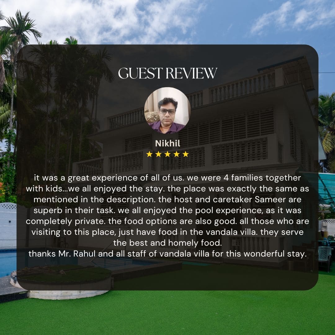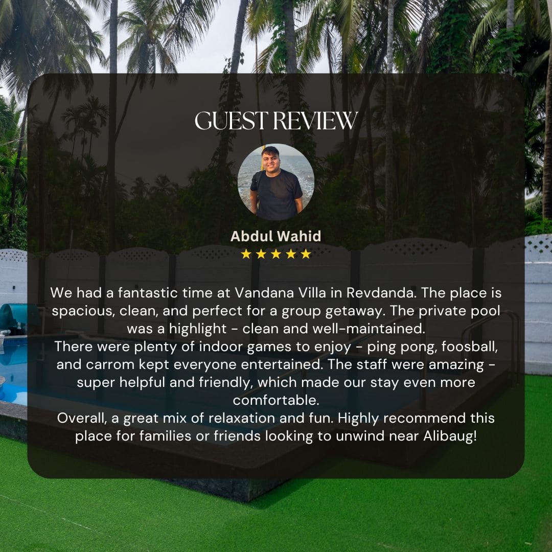 EXCELLENT Based on 366 reviews Advait Dubey2025-09-23Trustindex verifies that the original source of the review is Google. We were a group of 18 people and simply enjoyed our stay there. The rooms were spacious and the villa had enough to accomodate us all. The pool was also clean. The hospitality by Ms kartikee during booking and also during our stay was very cheerful and friendly. And the food provided by our villa manager Mr.Raut and his team was simply amazing. It was worth every penny of money. Just a simple request to make the parking more firm for especially vehicles like a traveller as the parking tends to accumulate water because of which big vehicles might get stuck in the mud. pavan Boda2025-09-13Trustindex verifies that the original source of the review is Google. Aryan Sharma2025-09-03Trustindex verifies that the original source of the review is Google. We had a great stay our there staff was very nice n humble n very jolly people Kartiki helped me alott literally very thankful to her pls visit this place it's very beautiful Anushree Shewale2025-08-18Trustindex verifies that the original source of the review is Google. Loved the stay! Aadesh Darole2025-08-17Trustindex verifies that the original source of the review is Google. Crazyy Experience, Loved the property sorrounding with coconut trees and Greenery!! Best for Family!! Yuvraj Patil2025-08-10Trustindex verifies that the original source of the review is Google. Food is awesome. akshay raorane2025-08-08Trustindex verifies that the original source of the review is Google. Hungry Traveller2025-07-22Trustindex verifies that the original source of the review is Google. Absolutely Loved Our Stay at Vandana Villa! We had an amazing time at Vandana Villa in Alibaug. The property is clean, spacious, and beautifully maintained. The rooms were cozy, and the entire villa had a peaceful, homely vibe. The staff was super helpful and made sure we had everything we needed. The location is great too—just a short drive from the beach and nearby attractions. Whether you’re going with friends or family, it’s a perfect getaway spot. Highly recommended for anyone looking for a relaxing and comfortable stay in Alibaug! manju verma2025-07-18Trustindex verifies that the original source of the review is Google. Mr.sameer is very helping natureand food quality is also good room and all very clean.😊 Prakhar Chawda2025-07-18Trustindex verifies that the original source of the review is Google. Must visit! Great Place