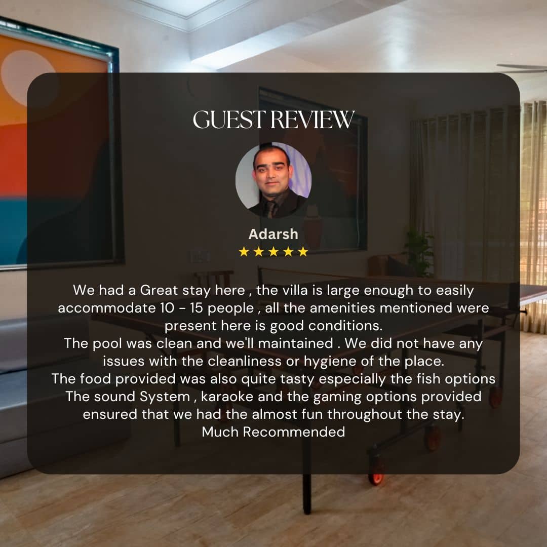 EXCELLENT Based on 33 reviews Rishikesh2025-08-19Verified Gud place😘Nyce Accomodation🍻Lovly Bitch Location 🏖🏖Njoy Fud🍌🍌🍗🍖 Muniza Khan2025-08-14Verified Lovely stay! Clean place and a good host. Would recommend. Krishna2025-08-08Verified Great stay the food was great and the host was responsive Mayank2025-08-01Verified Rahul's place was booked by me for my parents and their friends - a group of 9 70+ people. They were very happy with the stay, the hospitality and the food. Tanvi2025-07-24Verified We had a great time at Rahul’s Property.. food and as delicious..! Sushant2025-07-21Verified Good staff, Good host no late response we had a great experience here surely we will visit here again, villa is exact as it is described and more beautiful in real. Husaina2025-07-15Verified The place was nice Abdul Wahid2025-06-30Verified We had a fantastic time at Vandana Villa in Revdanda. The place is spacious, clean, and perfect for a group getaway. The private pool was a highlight - clean and well-maintained.There were plenty of indoor games to enjoy - ping pong, foosball, and carrom kept everyone entertained. The staff were amazing - super helpful and friendly, which made our stay even more comfortable.Overall, a great mix of relaxation and fun. Highly recommend this place for families or friends looking to unwind near Alibaug! Ananya2025-06-13Verified The place was super clean and amazing! And the rooms were very pretty, its pretty affordable as well Anjali2025-06-02Verified Beautiful property- had a lovely outing with my family and very very well maintained place. Highly recommend :)